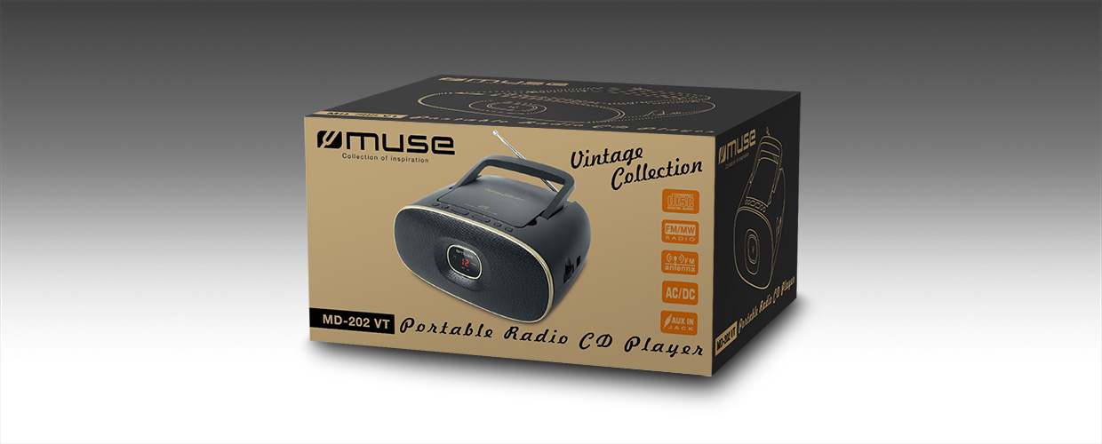 Muse MD-202 VT. Type de tuner: Analogique, Type de bandes supportées: FM, MW, Bande FM: 88 - 108 MHz. Lecteur optique: Lecteur, Types de disque supportés: CD, CD-R, CD-RW, Modes de lecture: Next, Précedent, Répéter tous, Répéter un. Type d"écran: LED, Couleur de Backlight: Rouge. Couleur du produit: Noir, Or, Pays d"origine: Chine. Source d"alimentation: AC/Batterie, Tension d"entrée AC: 230 V, Fréquence d"entrée AC: 50 Hz